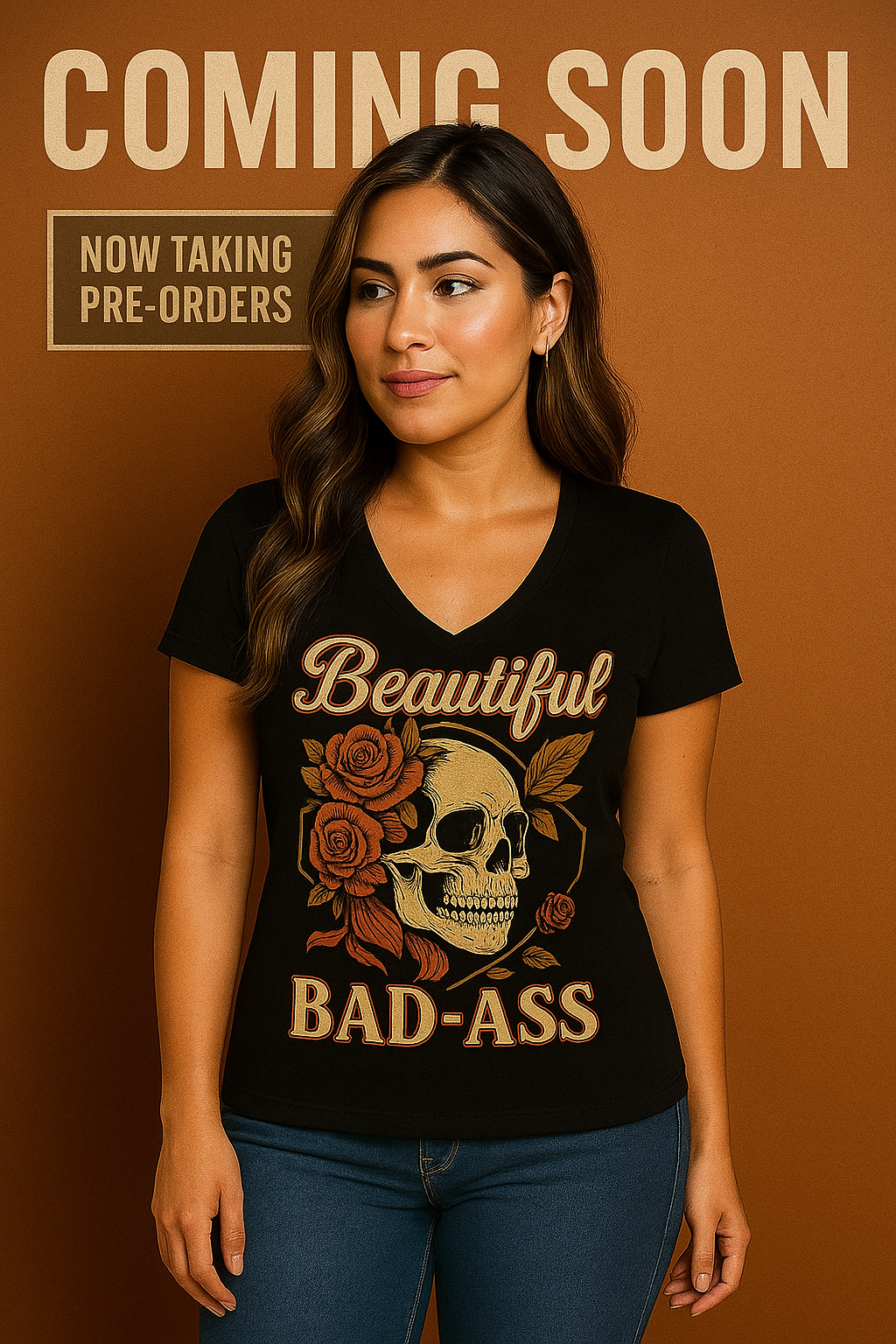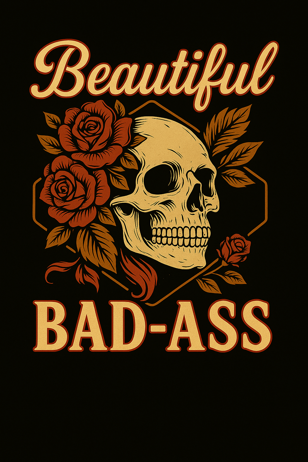 Product: Bold, feminine, and unapologetically fearless. The Beautiful Bad-Ass tee is made for women who own their strength. Featuring a striking skull and roses graphic with warm vintage tones, this V-neck blends beauty and grit in a way only Bee-Free can. Soft, form-flattering, and designed for everyday confidence, it’s the perfect statement piece for women who are as elegant as they are powerful.